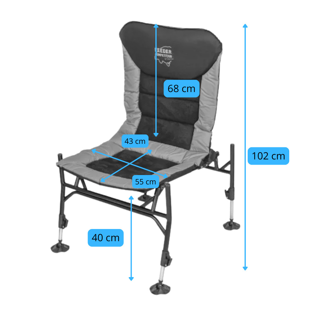 A nagy teherbírású acél vázzal szerelt Feeder Competition Super Feeder horgászszék párnázott, ergonomikus kialakítású. A lábak hossza a talaj egyenetlenségeihez igazítva tetszőlegesen állíthatóak. Dönthető talpakkal szerelte fel a gyártó, így sáros, egyenetlen terepen is stabil ülést biztosít. A kimondottan kényelmes ülőrészről könnyű felkelni, így hirtelen kapás esetén egy szempillantás alatt reagálhatunk még akkor is, ha a bot távolabb található. Feeder horgászathoz, bojlizáshoz, de akár klasszikus fenekező horgászathoz is kítűnő választás a Super Feeder horgászszék.