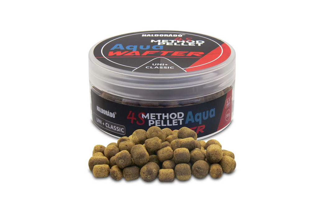 A 4S Method Pellet Aqua Wafter termékcsalád három tagból áll. Elérhető Uni, Classic, valamint az Uni+Classic változatokban. Nem nehéz kitalálni, hogy a név jelzi azt, melyik pelletfajta őrleményéből is áll a csali. A legérdekesebb az Uni + Classic, mely a két legnépszerűbb pellet 50-50%-os keveréke. Az Uni változat sötétbarna, inkább már fekete, a Classic változat világosbarna, míg a keverék e két színt fele-fele arányban tartalmazó csali. Közös tulajdonságuk, hogy mérsékelt felhajtóerővel rendelkeznek és lassan oldódnak.