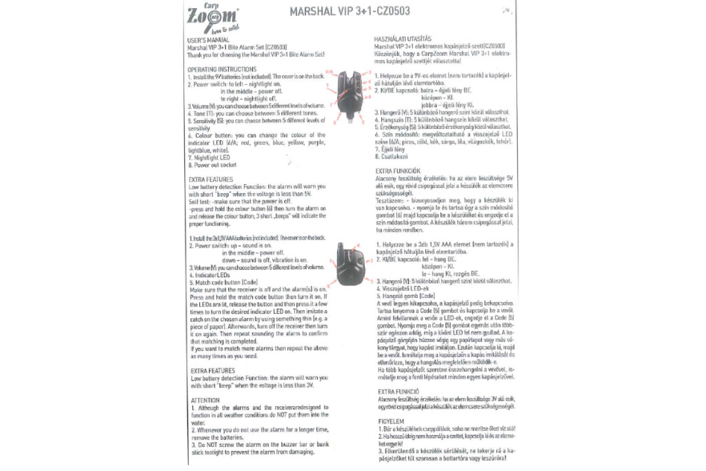 Az elektromos kapásjelzők tartós működéséről egy-egy 9 voltos elemmel gondoskodhatunk, a vevőegység 3 darab AAA elemmel működik. 3 db elektromos kapásjelző és 1 db vevőegség 5 fokozatú állítható, hangerő, tónus és érzékenység 7 színű, állítható energiatakarékos LED villogó Tartozék antenna Csiptető a vevőegységhez Automata hangolás Hangos és néma rezgő üzemmód Elemigény jeladó: 1 db 9 V-os elem vevőegység: 3 db AAA Jack dugó foglalat. Kompatibilis menet