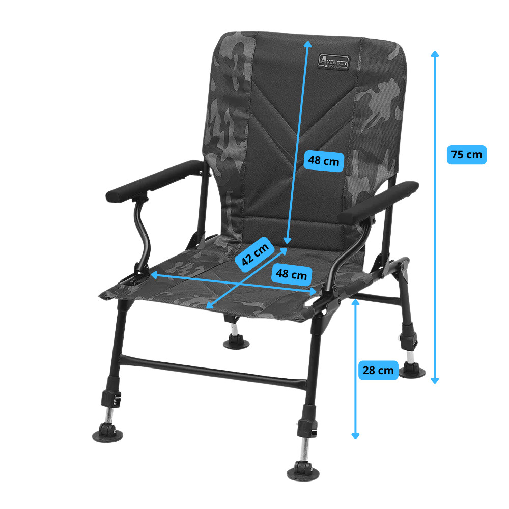 A puha, vastag párnázás és a gondosan kialakított matrac hosszú távon is kényelmet garantál, a masszív acél váz pedig stabil és tartós alapot ad, akár 140 kg terhelést is megbízhatóan megtartva. A teleszkópos, állítható lábaknak köszönhetően a szék könnyedén alkalmazkodik az egyenetlen talajviszonyokhoz, miközben a forgó sártalpak biztosítják, hogy mindig stabilan álljon. A kényelmet tovább fokozzák a neoprén borítású kartámaszok, amelyek még hosszabb ülés során is kellemes alátámasztást nyújtanak.