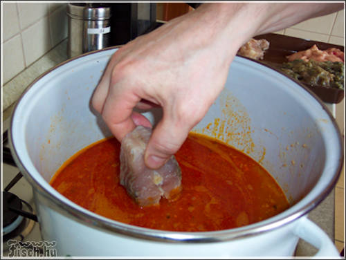 Az átpasszírozott levesünket gyakori kavargatások mellett ismét feltesszük lassú lángon főni, ügyelve rá, hogy az alja oda ne kapjon. Amennyiben már a levesünk elkezd forrni, jöhetnek a végső ízeket meghatározó legfontosabb komponensek. Ekkor tegyünk még bele 3-4 evőkanál pirospaprikát (ízlés szerint ez lehet több vagy kevesebb), diónyi piros aranyat, a cseresznyepaprikát, a belsőségeket és a pontyszeleteket. Miután a halak is belekerültek, már nagyon óvatosan kavargassuk, vagy csak rázogassuk. A forrástól számítva 15-20 percig főzzük, friss puha kenyérrel, és ha módunkban áll egy pohár kadarkával kínáljuk.