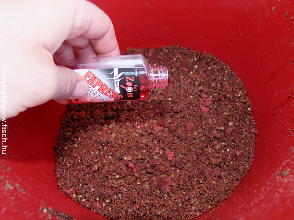 Közben elkészült az etetőanyag, a szemcsék kellően megszívták magukat nedvességgel. Már csak az Attraktor Aromát kellett hozzáadni. Ezt legtöbbször akkor használom, ha rövid időre megyek horgászni, és kevés, de hatékony etetőanyagot használok. Az előkészített végszereléket egyszerűen csak felcsatoltam a főzsinór végére, és jöhetett a csalizás, no meg persze az észrevétel.