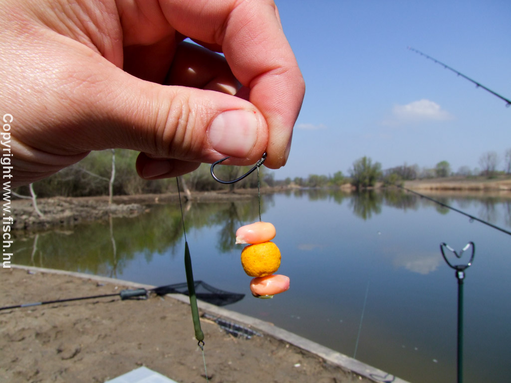 A hajszálelőkére felkerült két szem szúnyoglárvás kukorica, közéjük pedig egy mini Pop Ups bojli. Így csak annyira könnyült el a csali, hogy a horog tartotta a fenéken. Nem nagy ördöngösség, mégis a csali sokkal feltűnőbb. Bedobás után közösen vártuk azt a pillanatot, amikor a spicc karikába hajlik. Az országos szabályzat szerint gyerek horgász csak úszós készséggel horgászhat, de az egyes magán tavak ettől eltérhetnek, ezért engedtem meg én is.