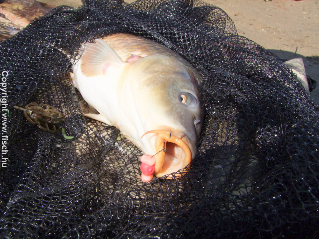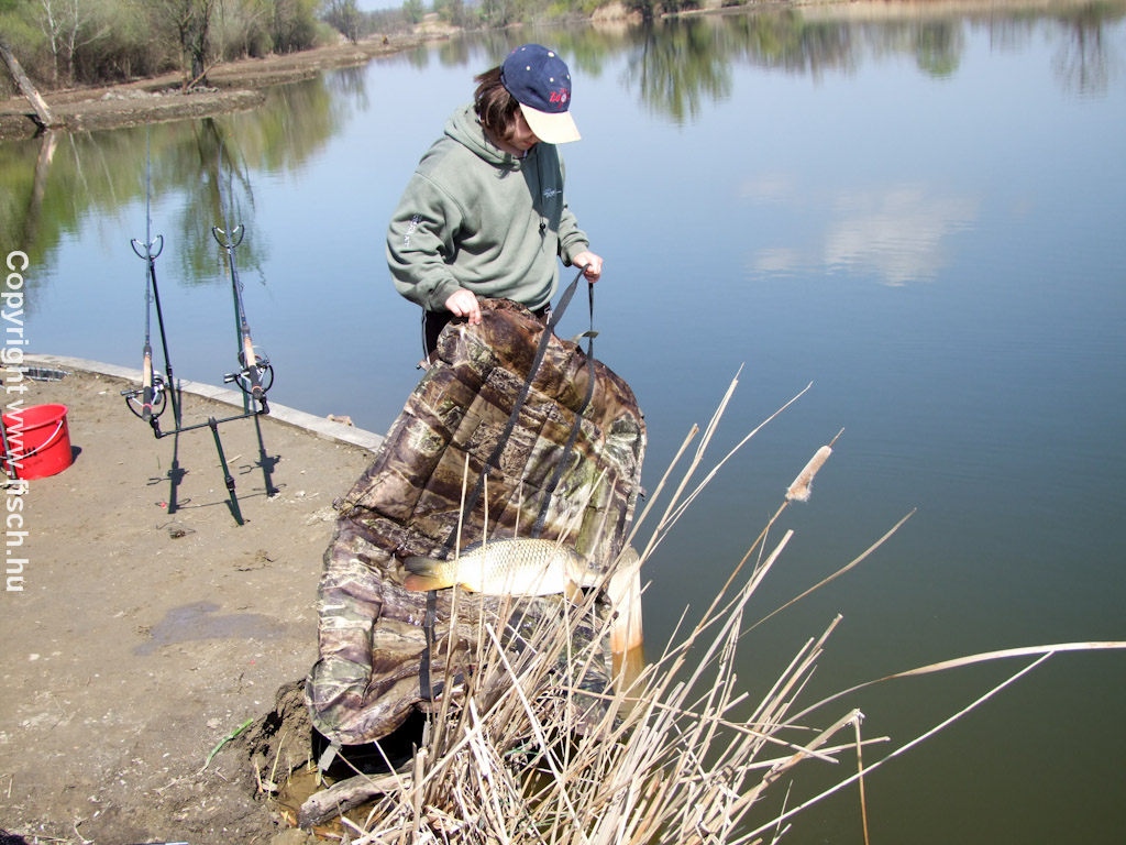 Látod ezért hoztuk azt a sok kiegészítő felszerelést. - mondtam magyarázóan. A sebfertőtlenítéshez a sűrű szövésű nagyméretű merítőből egyből a vizes matracra tettük a halat. A merítőháló minél sűrűbb, annál nehezebben akad bele a ponty fogazott bognártüskéje. A matrac a vergődő halat védi az ütődésektől, fontos hogy vizes legyen, mert így sérül a legkevésbé a nyálkahártyájuk. A táskából előkerült az apró sebfertőtlenítő spray, és lefújtuk a horog ütötte sebet és a többit is. A fárasztás során nem csak a száj szokott sérülni.
