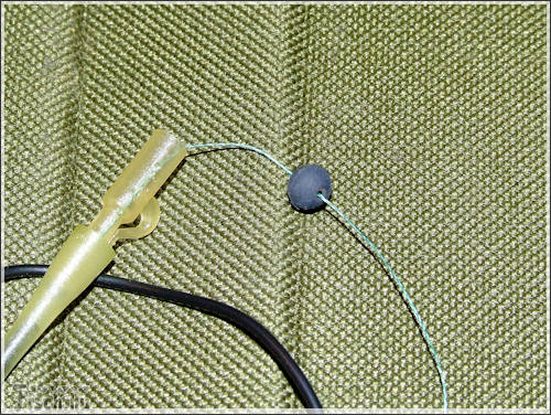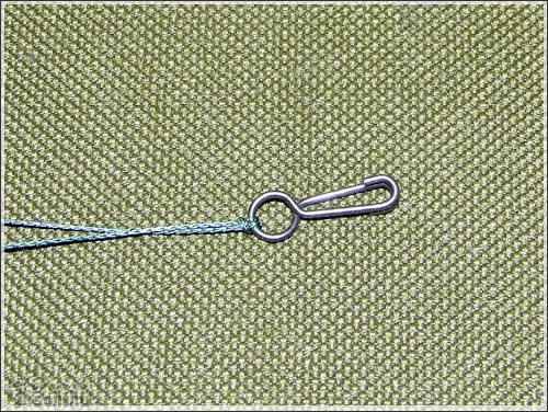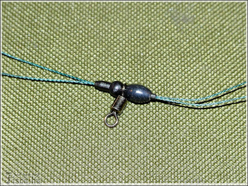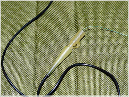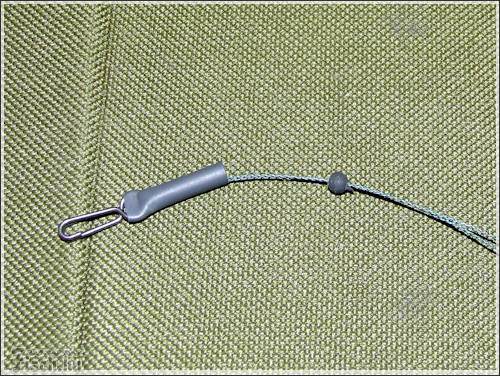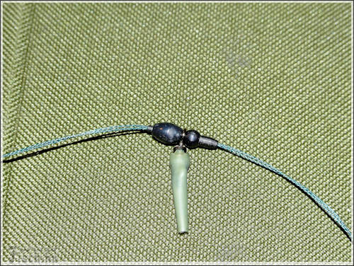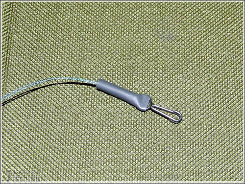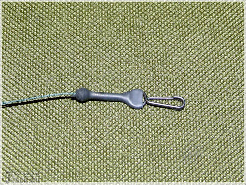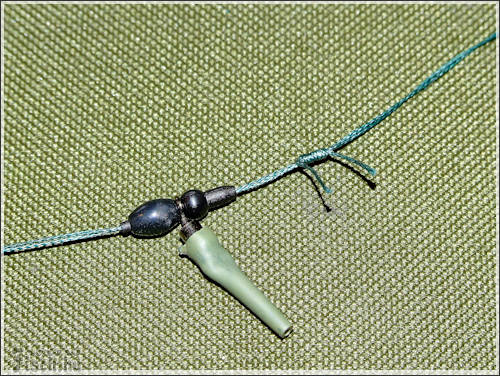A következő szerelék alapjaiban más összeállítás, mint az előző. Itt is a fonott zsinór a lelke a szereléknek. Méghozzá duplán fogva, összesodorva. A tekercsről levágtam 80 cm-t. Félbehajtottam, majd ráhurkoltam a kapcsot. A zsinórra ezután felhúztam egy zsugorcsövet, de ezután még nem melegítettem rá. A sorban következő apróság egy gumigyöngy, aminek akkorának kell lennie, hogy belecsússzon a szilikoncsőbe. Ez után már rá lehet melegíteni. Most jön az érdekes rész, az előre összeállított forgós-csúszó - előketartót is felhúzzuk. Majd kötünk alá egy ütközőt, ugyan olyan zsinórból, mint amiből a szerelék van. Még nem vagyunk készen, most meg kell sodorni a két szálat, hogy azok mereven álljanak. Majd végül erre a szerelékre is kötök egy acél karikát.