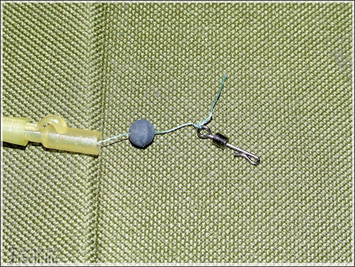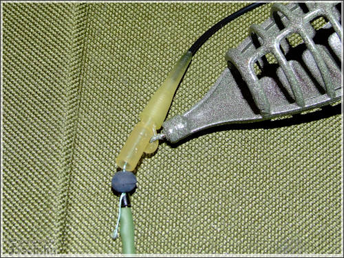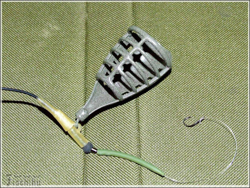 De kezdjük az elején. A fonott zsinórt nem egyszerű belefűzni a csőbe. Használjunk vastag (0,25-0,30mm) monofil zsinórt, vagy befűző drótot. A sorban a következő a műanyag kapocs, ami a kosarat fogja tartani. Ezt egészen ráhúzom a csőre. Az ütköztetésről sem szabad megfeledkezni, ezért fel kell húzni egy megfelelően nagy gumi gyöngyöt. Ez után következhet a speciális forgókapocs (1 sz. ábra). Azért speciális, mer a forgó egyik oldala egyben a kapocs, nem külön van ráapplikálva. A forgóhoz tartózó rövid szilikon csövet