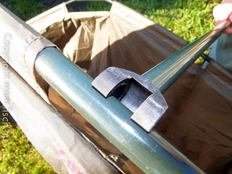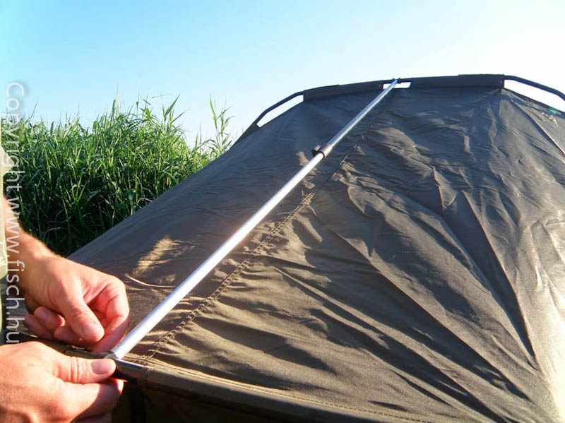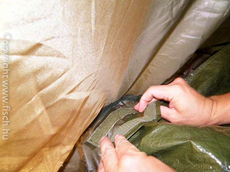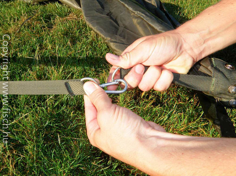 A bejárat felöli váz alját a hozzá erősített hevederrel tudjuk megfeszíteni és egy karabinerrel összekapcsolni.