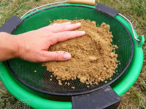 Ez lehet föld vagy finomabb szemcseméretű kavics, amelyet a sodrás erősségéhez mérten 20-50%-os súlyarányban szokás vegyíteni. A föld használatakor persze felmerülhet a kérdés, mégis melyiket? Sötétet, vagy világosabbat? Földet esetleg löszt? Lehetne érvelni és vitatkozni ebben a kérdésben, de ezt rendszerint az adott víz sajátosságai és az ott élő halak táplálkozási szokásai határozzák meg. A fekete föld, tökéletesen megfelel nehezítőnek, melyben a világosabb szemcsék szinte világítanak majd a mederfenéken, viszont a folyamatos bontás nem lesz annyira látványos és csalogató, mint ha löszös földdel nehezítettük volna eledelünket. Ugyanakkor a lösszel dúsított „füstölgő" világító etetőanyag gombócok akár a terület összes halát képesek elriasztani vagy éppen fordítva, egy sávot képezve a halakat odacsalogatja a megfelelően kialakított etetésünkre. Most lássuk képekben, hogyan lehet mindezt kivitelezni a vízparton: