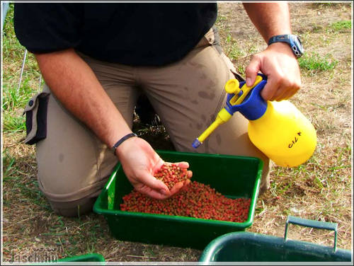 Etető pellet is lehet aromásítani, sőt, érdemes is. folyadék aromával egyszerű, csak ráöntjük és használható is. A másik módszer a következő. Egy tálba kiöntjük pelletet, majd a felületüket megvizezzük. Pár perc már por aromásítható is. A felületükre az rátapad, a vízbe érve az robbanásszerűen feloldódik. Ezzel a közelben lévő halak érdeklődését felkelti, majd az oda érkező halak a horogcsalit is felveszik.