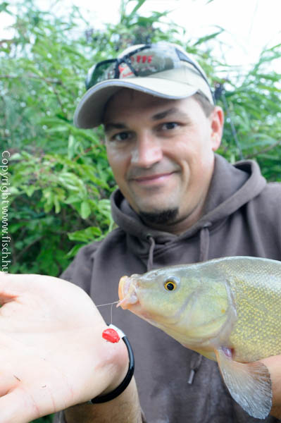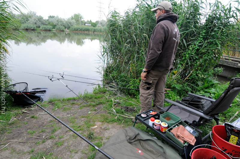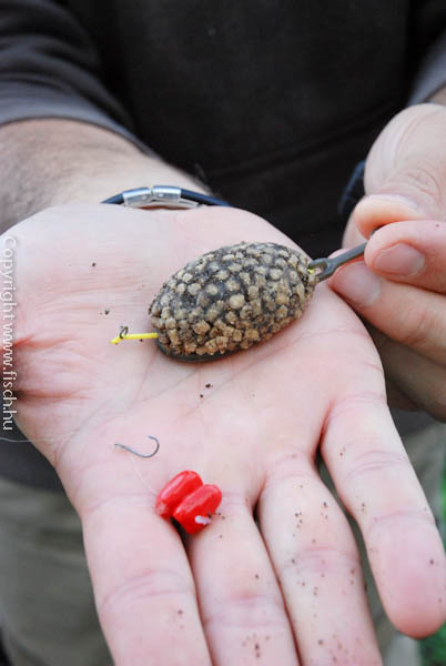 A partra érve, mint a kisgyerek aki először horgászik, lázban égtem, hogy végre horgászhassak. A botokat már otthon összeállítottam. A 18-as monofil zsinór végére kötöttem a speciális, erőgumis kosarat. Az erőgumiba kötött acélkarikába egy 17-es, szintén monofil zsinórból készített előkét hurkoltam. Ennek a hossza mindössze 15 cm volt. A horog apró, de öblös, a hajszálelőke az előkezsinór anyagából készült. Egyszerű és gyors csalizást tesz lehetővé az apró hurokba kötött műanyag tüske. Ezt a tüskét csak átnyomjuk a csalin, az ott keresztbe fordul, és készen is van.