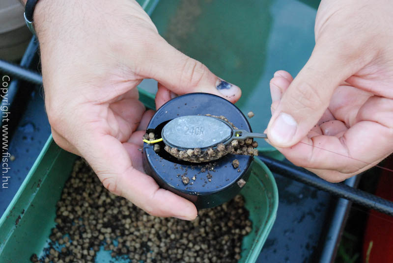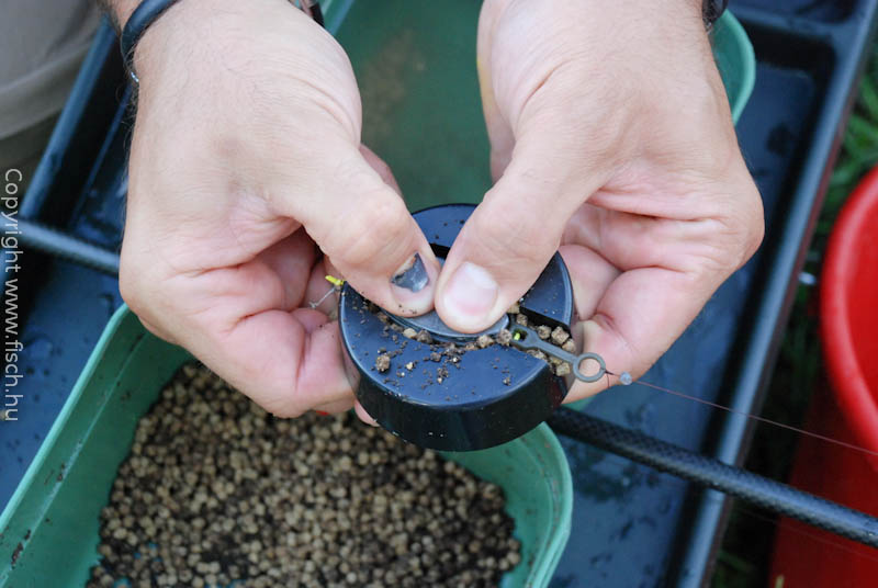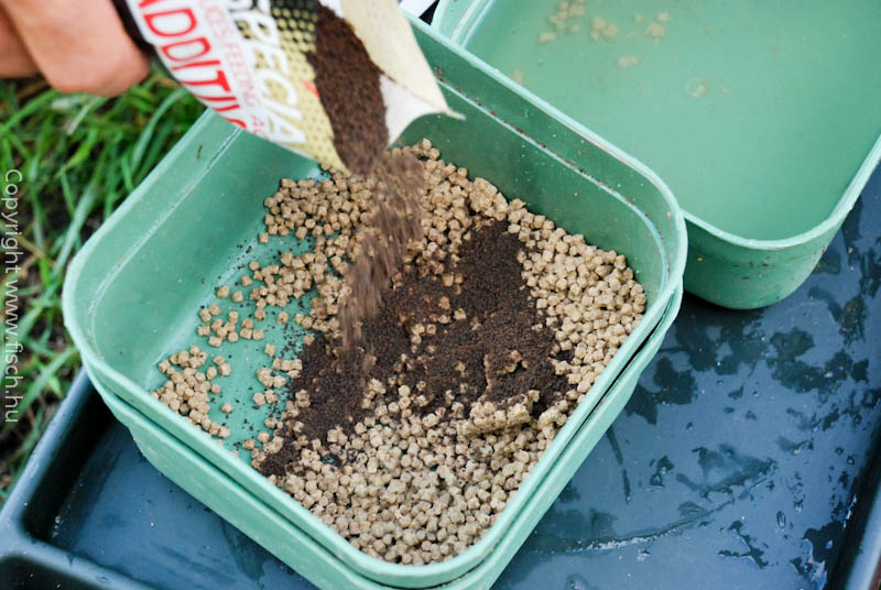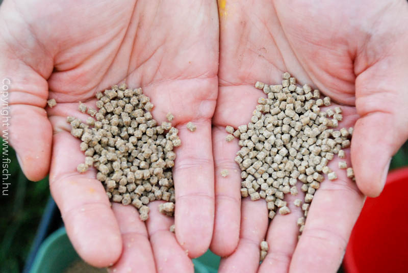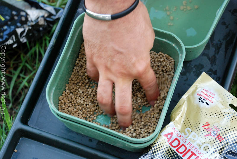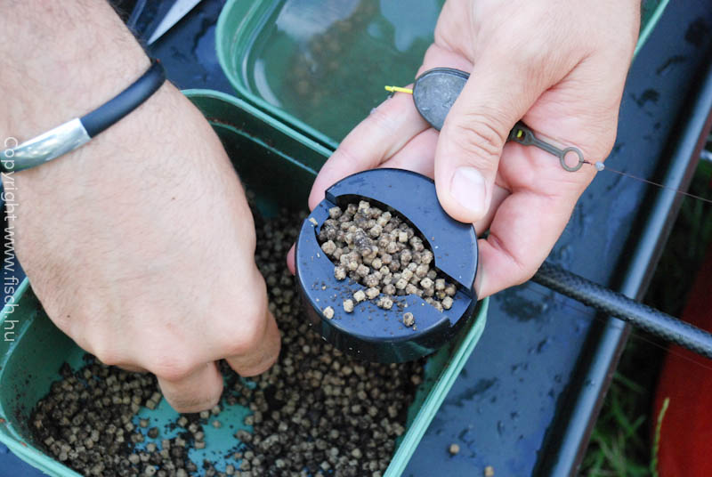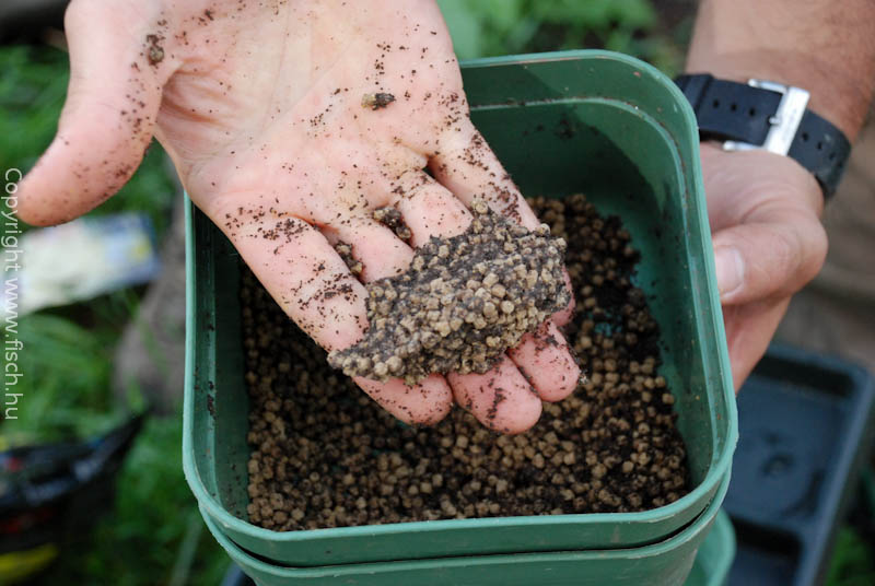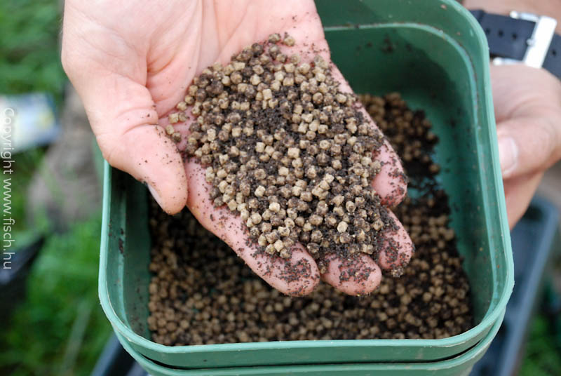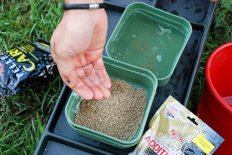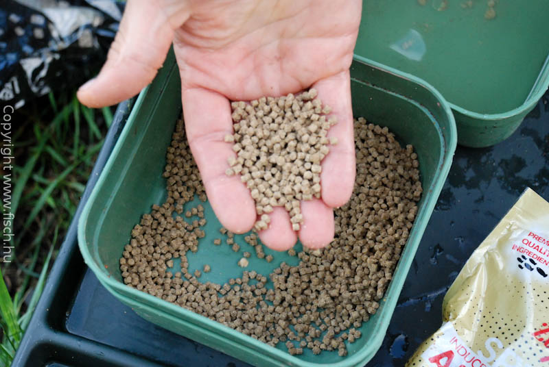 Mivel minden készen volt a horgászathoz, már csak a kosárba valót kellett elkészítenem. Sokféle pelletet lehet ma a horgászboltokban kapni, de nem mindegyik alkalmas erre a technikára. Sem a tészta-pelletet, sem a magas olajtartalmú pellettet nem lehet megfelelően előkészteni erre a módszerre. A legjobb 7-12% olajtartalmú, lehetőleg színezőanyag nélküli natúr pellet.