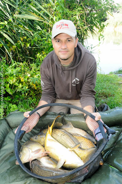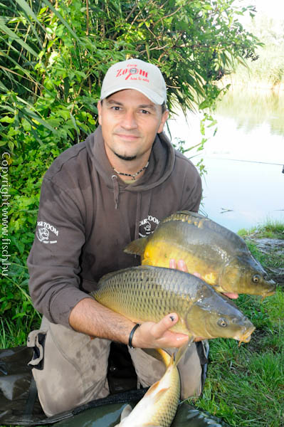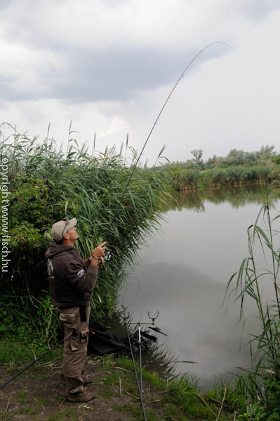 Az első kapás nem váratott sokat magára. Éppen az ásványvízből kortyoltam, amikor a szemem sarkából a félbehajtott botot pillantottam meg. Az első ponty alig érte el a másfél kilót, de szépen védekezett az érzékeny felszerelés ellen. Angol típusú botokat használok, mert a fárasztás elején lágyak. Azonban ha erőltetem, akkor egy pontban felkeményedik és a nagyobb halakat is meg lehet fogni vele. Mivel a halak ízlését az összeállítás telibe találta, az első óra vége fele az egyik botot ki is kellet vennem, mert nem győztem a kapásokat. Bár nem mindet tudtam megfogni, mert az apróbb keszegek és kárászok is nagy kapásokat csináltak a közepes méretű csalival. De nem zavart, mert ha jobb hal talált rá a kukoricákra, akkor az szinte elvitte a botot.