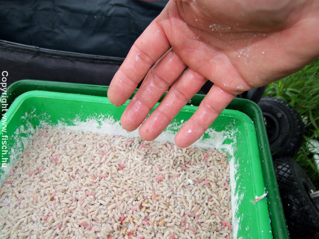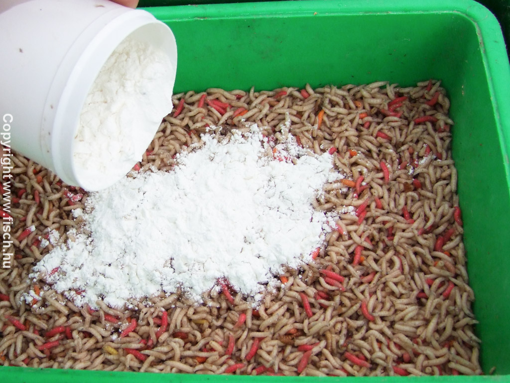 A kukacokat és az adalékot (jelen esetben kavics) egyben (vagy akár külön) megszórjuk porral. Csak annyit, hogy a felületüket éppen befedje. Érdemes lyukacsos aljú edényt használni, hogy a felesleg egy másik edénybe hulljon. Majd permetezővel, vagy kézzel egészen picit megvizezzük. Majd alaposan elkeverjük és várunk egy kicsit, hogy elkezdjen dolgozni a ragasztó.