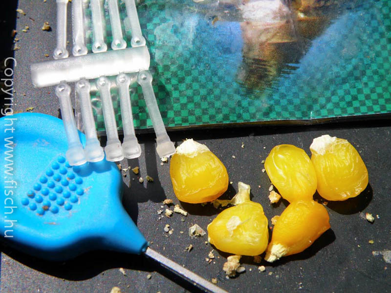 2. apró trükk: A horgászat elején tegyünk ki a napra pár szem keményebb kukoricát (üveges Prémium Maize). Egyik kedvencem a méz ízesítésű. 1-2 óra alatt „megfonnyad”, ezután fűzzünk fel 2-3 szemet szilikonra, vagy hajszálelőkére. A folyadékvesztés következtében a szemek könnyebbek lesznek, így a vehemensen táplálkozó halak is könnyebben felszippantják.
