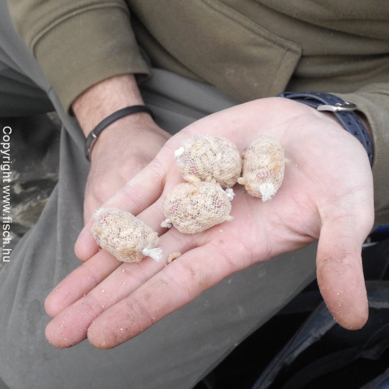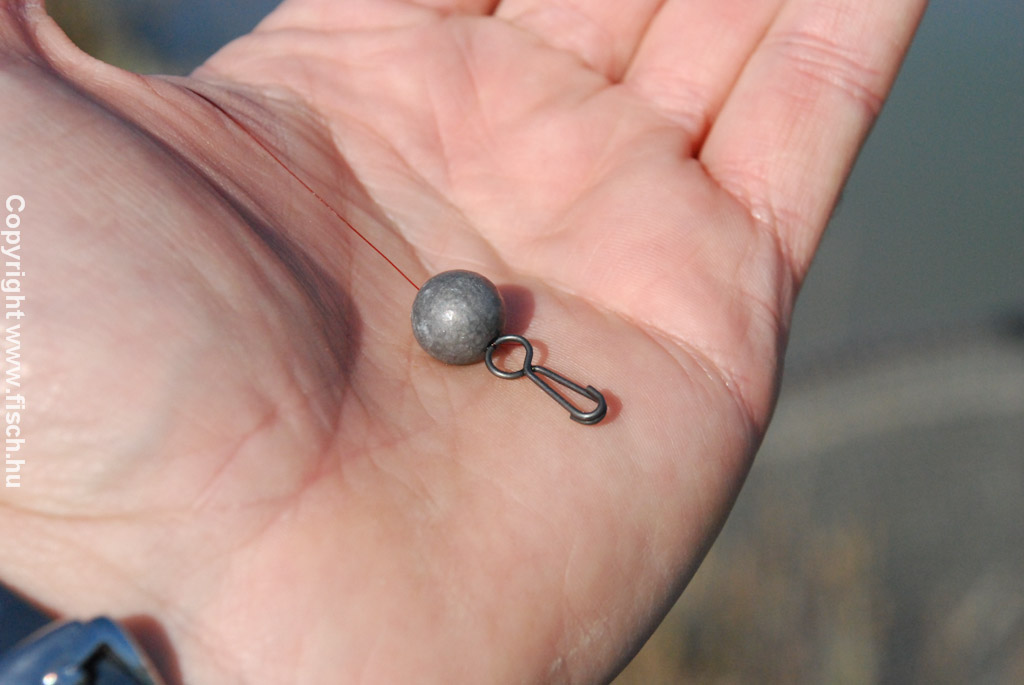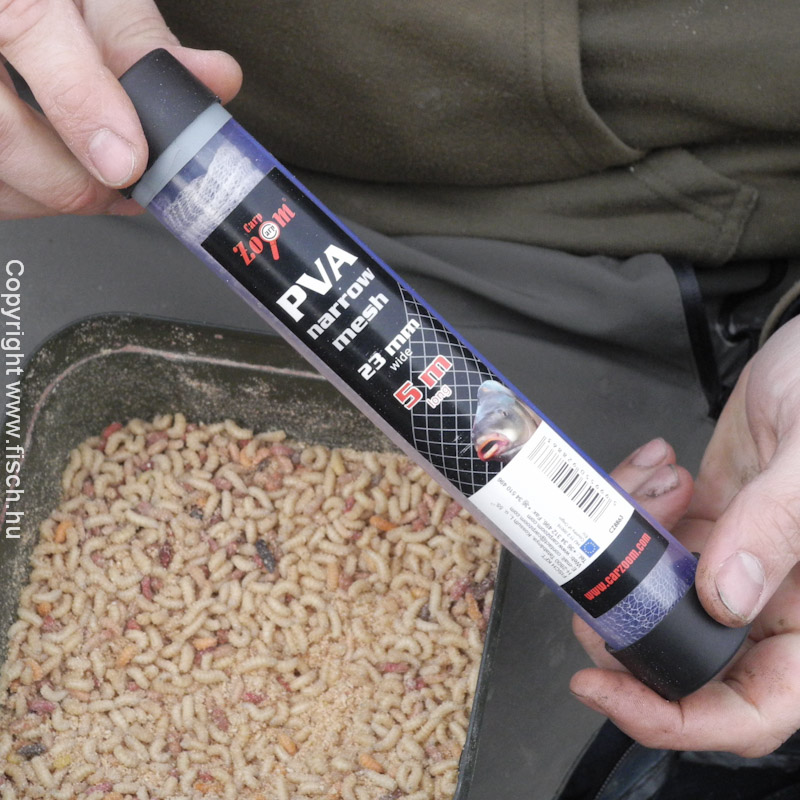 A szereléket egy perc elkészíteni. A főzsinórra felhúzzuk az ólmot, majd a gyöngyöt, és a zsinór végére kötjük a kapcsot. A kapocs szerepe kettős, ide akasztjuk a felcsalizott előkénk és a csalogatásra szánt, apró PVA hálóba csomagolt csontkukacokat. Itt elérkeztünk a szerelék lelkéhez a jó minőségű, hideg vízben is gyorsan oldódó PVA hálóhoz, ami akkor 23mm-es méretű volt.