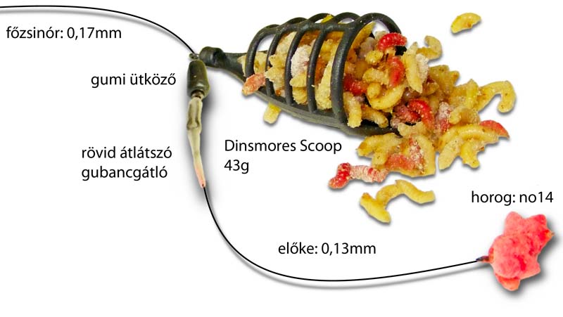 A szerelék összeállítása legalább annyira egyszerű ilyenkor, mint maga a csali. Hidegben ledermedt kézzel amúgy is gyötrelem bonyolult szereléket összeállítani. A light szett lelke egy gumiharang, amit a forgóra teljesen ráhúzunk. Ez védi a forgó, ütköztet, és az előkét oldalra eltartja, így csökkenti a gubancolódást. A főzsinórra felhúzzuk a kosarat, majd a gumit, és felkötjük a forgót. Ebbe belehurkoljuk az előkét, és ráhúzzuk a rövid gubanc-gátló csövünket. Ha a szerelékünk kész, akkor csak egy pici darabot kicsípünk a ragasztott kukacokból, és erőteljesen belenyomjuk a Dinsmores Scoop kosár kúpos belsejébe. Még nem volt rá példa, hogy dobáskor kiesett volna belőle a töltet!