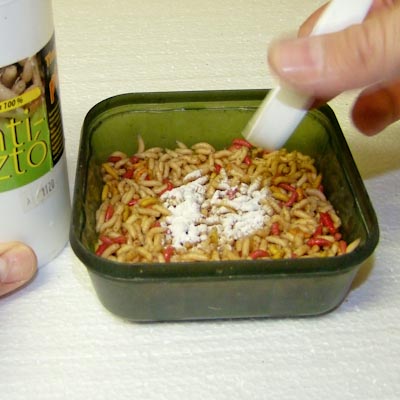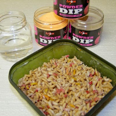 Csali, poraroma, és a víz. A horogra húzott kukacokat először megvizezzük. Majd megmártjuk a Powder por dip-ben. A por vastagon befedi a kukacokat, használatra kész! Tíz féle ízben kapható, a szokottnál nagyobb kiszerelésű Carp Zoom por dip.