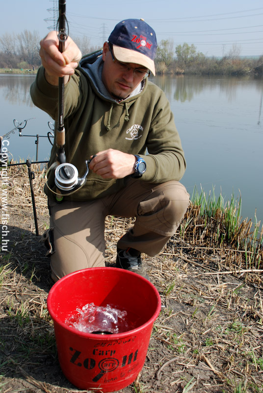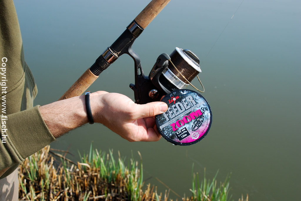 A helyzetem nem könnyítette meg, hogy ez a sekély rész a tónak a horgászhelyemmel szemközti oldalán volt. Persze ez csak erősítette a hitem, hogy így teljesen zavartalanul élvezik a hatalmas pontyok a napsütést. Az orsóm dobjára gyorsan felcsévéltem egy tekercs új 0,22 mm-es feeder Zoom zsinórt, majd egy egyszerű gubancgátlós kosarat kötöttel fel. A távdobó mesterek mindig büszkélkednek, hogy ennyi meg annyi métert dobtak. Én azt vallom, inkább biztonsággal horgásszuk meg a kiszemelt részt, a számokat hagyjuk meg a matematikusoknak.
