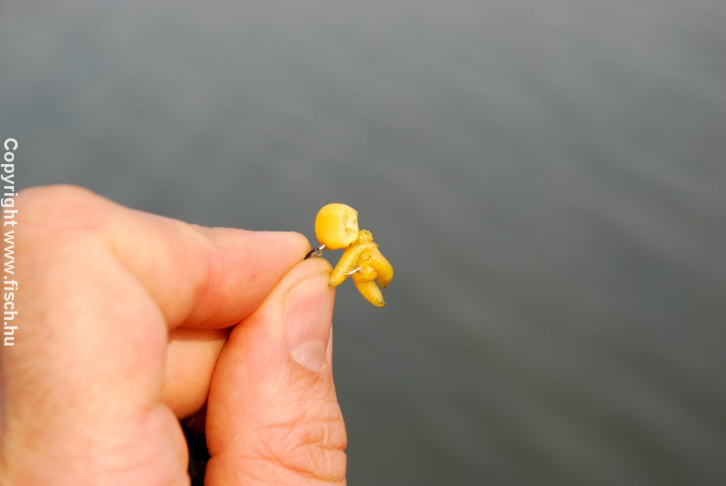 A szerelék sorban legutolsó, de annál koránt sem elhanyagolható apró része a horog, horogelőke és természetesen a csali. Az előkét az új zsinórunkból, a Carp „N" Carp hooklink-ből kötöttem, hossza mindössze 15cm volt. A horgot úgy választottam, hogy éppen ráférjen 3-4 db csontkukac és egy, esetleg két szem kukorica. Ezzel már el is árultam mi volt a csali. Minden pontyhorgászat alapja ez a két csali, kombinálva pedig csak javul a fogás esélye.