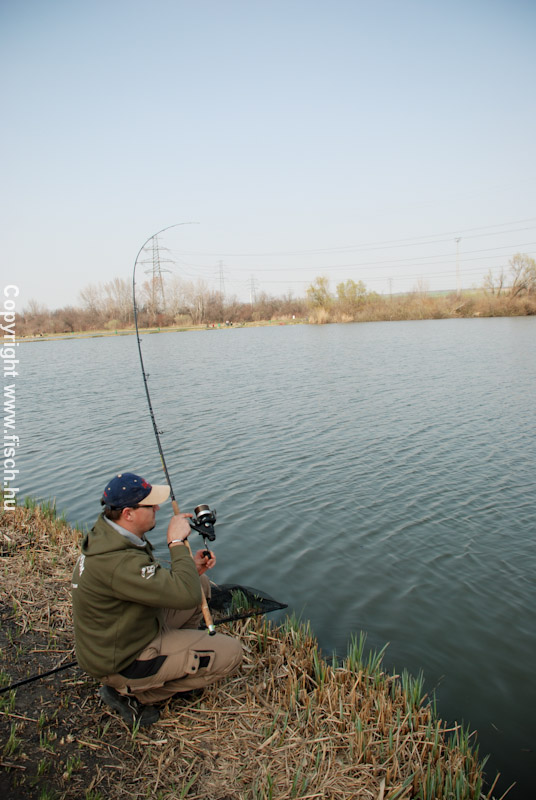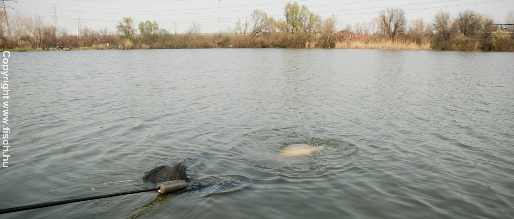 Be kell, hogy valljam, az első kapásra majd 4 órát vártam. Azonban megérte, mert az óvatos, a meg-meghúzós kapásra bevágva lomha ellenállásba ütköztem. Magamban örültem az első kapásnak, a húzásból éreztem, hogy jó hal lesz. A hideg víz miatt az ellenállása hamar megtört. Nem kellett pár perc és a szákban pihent. Első ránézésre tisztán látszott, őt nem viselte meg a téli koplalás. A horog a szája alsó részébe akadt, erősen tartott, így akadnak a nem lebegtetett csalival szerelt horgok. Nem is szerettem volna többet, egy-két fotó, és már úszhatott is vissza napozni a szemközti partra.