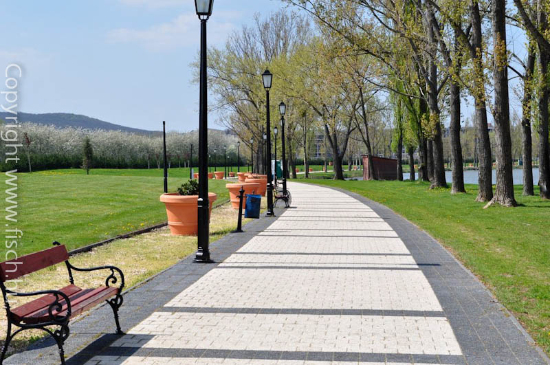 Sportoláshoz, sétáláshoz a tó köré egy irigylésre méltó, roppant hangulatos sétány épült. A növényzetnek egyedileg kialakított öntözőrendszere van, az éjszakai világításhoz az energiát a háttérben meghúzódó szélkerekek termelik. A múltat idéző hangulatos kandeláberek látványától a szívem bizony nagyot dobbant.
